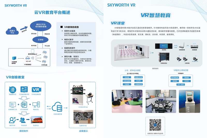 針對K12教育,創(chuàng)維VR擁有一套完整的VR智慧教育解決方案,其中包含硬件(VR一體機、服務(wù)器、網(wǎng)絡(luò)支持設(shè)備、充電消毒柜)、軟件系統(tǒng)(云端教務(wù)云系統(tǒng)、VR教室中控系統(tǒng)、管理員/教師管理客戶端、VR眼鏡學(xué)員控制端)及課程內(nèi)容;
