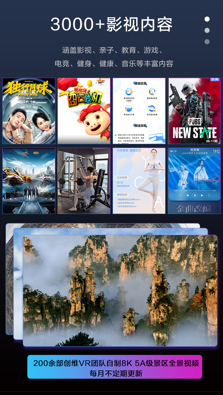創(chuàng)維VR團隊自制全國5A級景區(qū)8K 全景視頻,是目前國內(nèi)文旅內(nèi)容最多之一,用戶足不出戶,就可以身臨其境暢游九寨溝、云岡石窟、五岳衡山……