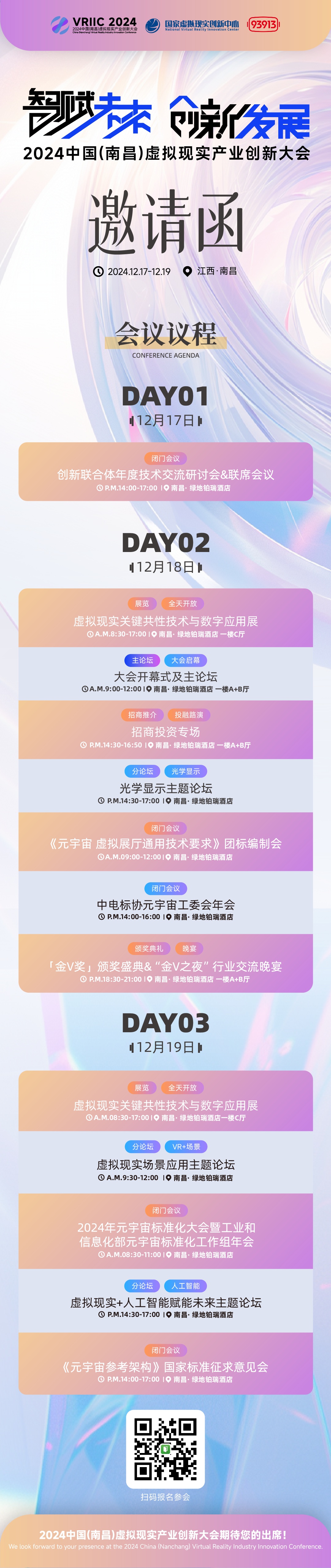 12月17日-19日,讓我們相聚南昌,共同見證2024中國(南昌)虛擬現(xiàn)實產(chǎn)業(yè)創(chuàng)新大會這場年度盛典,一同展望虛擬現(xiàn)實產(chǎn)業(yè)的無限未來!