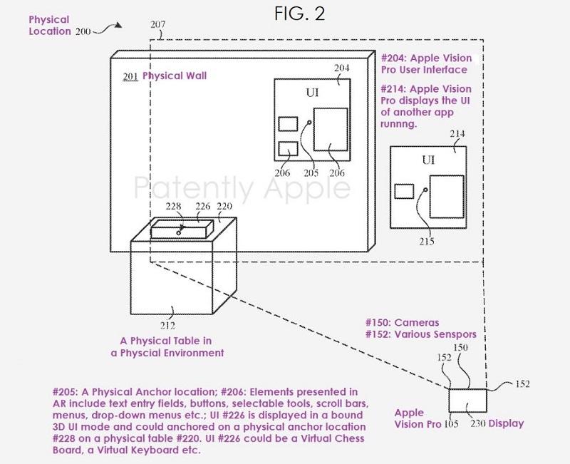 蘋果專利圖2說(shuō)明了擴(kuò)展現(xiàn)實(shí) (XR) 環(huán)境示例,包括XR頭顯(Apple Vision Pro) 顯示的多個(gè)用戶界面,以出現(xiàn)在物理環(huán)境中的多個(gè)相應(yīng)位置。