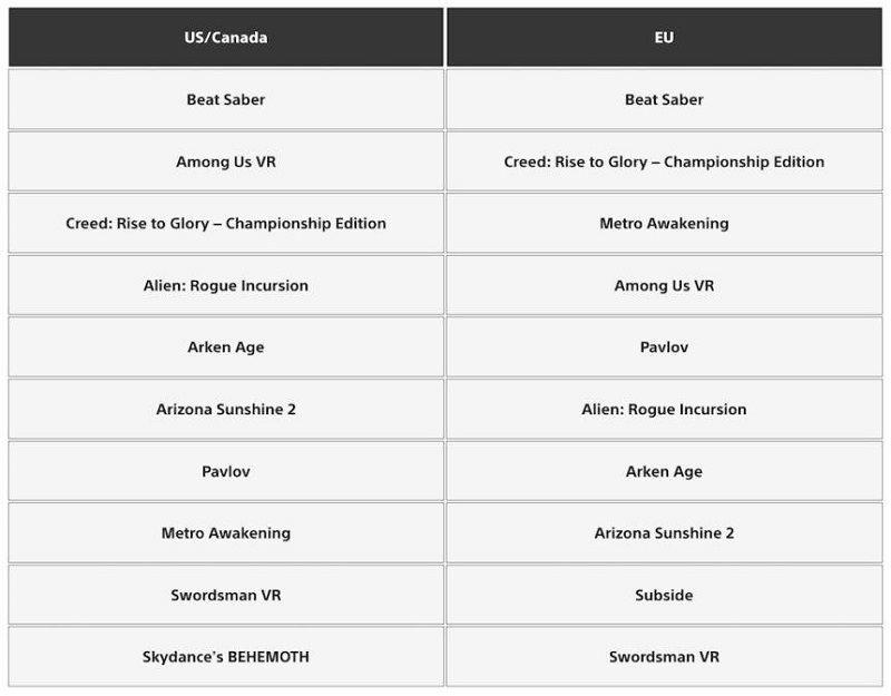 以下是2025年1月按北美和歐盟地區(qū)細(xì)分的熱門PS VR2游戲下載排行榜: