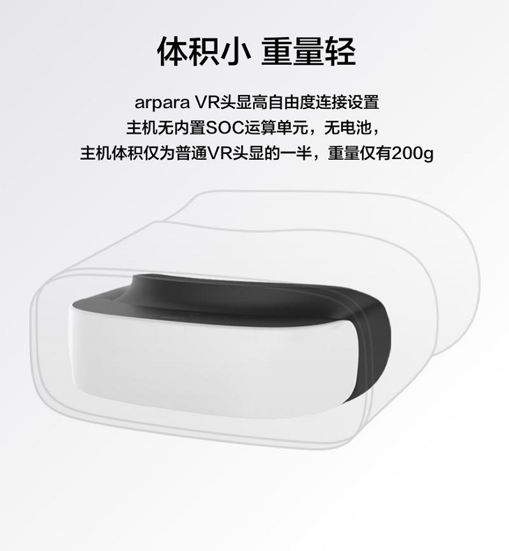 采用這套方案不僅為arpara的兩款設(shè)備帶來(lái)了頂尖的顯示效果,同時(shí)也為VR設(shè)備的輕量化帶來(lái)了極大的助力,讓VR設(shè)備變得前所未有的輕小便攜。以arpara 5K VR頭顯來(lái)說(shuō),其頭顯重量?jī)H有200g,即使加裝全部配件,重量也僅300g左右,配上arpara基于人體力學(xué)原理的頭箍設(shè)計(jì),為用戶長(zhǎng)時(shí)間舒適佩戴上了雙層保險(xiǎn)。