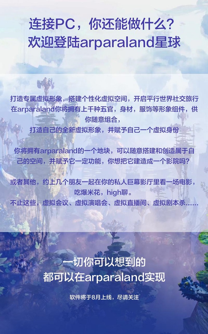 arpara的目標(biāo)是讓其VR硬件成為進(jìn)入元宇宙的入口,這一目標(biāo)不僅需要出色的硬件作為基石,還需要依賴內(nèi)容生態(tài)的展開。arpara正在積極拓展其內(nèi)容生態(tài),未來(lái)將會(huì)有百余款VR游戲陸續(xù)入駐其內(nèi)容平臺(tái),同時(shí)還計(jì)劃接入Viveport,為用戶帶來(lái)更豐富的內(nèi)容選擇,此外,arpara元宇宙內(nèi)容戰(zhàn)略的重中之重是其自研的虛擬社交平臺(tái)——arparaland。