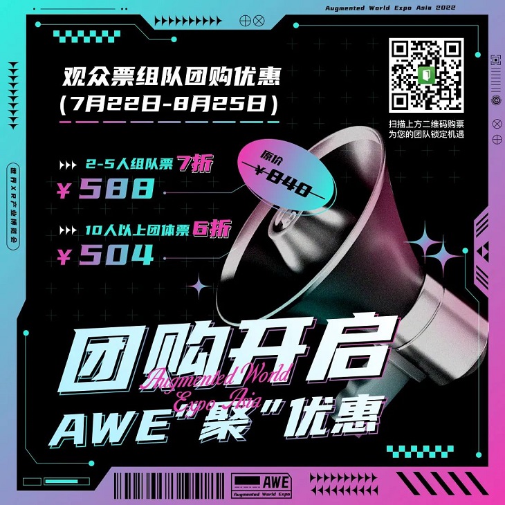 大會(huì)門票正火熱發(fā)售中,除目前可購買的單人優(yōu)惠觀眾票與VIP票之外,官方購票平臺(tái)現(xiàn)已推出組隊(duì)優(yōu)惠門票(2-5人)、(10人以上),多人組隊(duì)親臨大會(huì)可享超低折扣!掃描二維碼即刻購票參展!