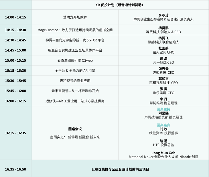 聲網(wǎng)聯(lián)合五源資本發(fā)起的「超音速計(jì)劃」現(xiàn)已成為AWE Asia 2022大會(huì)重要合作伙伴。AWE Asia今年的分論壇「XR優(yōu)投計(jì)劃」將與「超音速計(jì)劃」獨(dú)家合作,扶持XR創(chuàng)業(yè)企業(yè)的加速成長,共同推動(dòng)優(yōu)質(zhì)企業(yè)的破圈發(fā)展與創(chuàng)新。