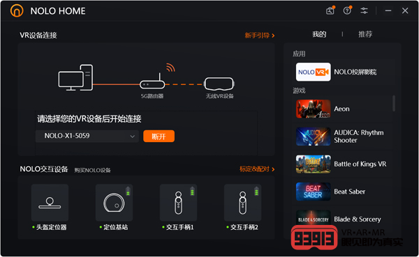 通過(guò)NOLO VR的這套空間定位技術(shù),不僅能提供頭、手6DoF的房間級(jí)定位追蹤和交互,輕松追蹤空間內(nèi)人物的自由移動(dòng),搭配自研的串流軟件NOLO HOME,經(jīng)過(guò)簡(jiǎn)單操作,還實(shí)現(xiàn)NOLO X1與PC之間的無(wú)線數(shù)據(jù)傳輸,暢玩「節(jié)奏光劍(Beat Saber)」、「半衰期:愛(ài)莉克斯(Half-Life:Alyx)」等千余款SteamVR游戲大作,徹底擺脫線纜束縛,放開手腳隨意活動(dòng)。