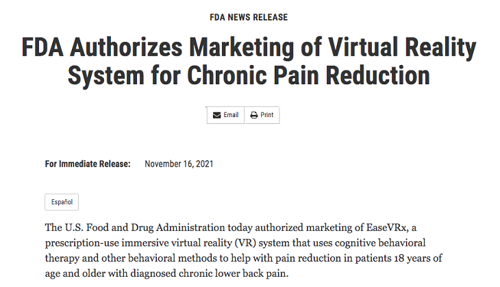 11月16日,F(xiàn)DA授權(quán)了一款使用VR來減輕慢性腰痛的處方系統(tǒng)EaseVRx,這是第一個(gè)也是唯一一個(gè)獲FDA批準(zhǔn)的用于慢性腰痛的家庭VR治療系統(tǒng),同時(shí)也被授予突破性設(shè)備稱號。