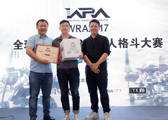 上午進(jìn)行的Ganker機(jī)器人格斗大賽緊張激烈,取得季度賽資格的三支戰(zhàn)隊一物降一物,各得2分,打成平手。下午的機(jī)器人足球比賽更是高潮迭起,險象環(huán)生。深圳Beyond戰(zhàn)隊和北京戰(zhàn)狼隊分別以4:2、3:2戰(zhàn)勝上海炫之隊,緊跟著Beyond戰(zhàn)隊經(jīng)過一番苦戰(zhàn)以2:0力克戰(zhàn)狼隊,奪得WRA2017全球Ganker機(jī)器人格斗大賽(上海季度賽)冠軍,并喜獲大獎 — 工匠社提供的價值人民幣2680元的新款Ganker機(jī)器人。