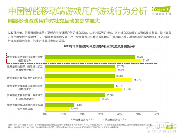 根據(jù)艾瑞發(fā)布的《2014年中國(guó)智能移動(dòng)端游戲用戶行為研究報(bào)告》顯示,無(wú)論是單機(jī)移動(dòng)游戲用戶還是網(wǎng)絡(luò)移動(dòng)游戲用戶,均有50%左右的用戶“希望玩家之間可以實(shí)時(shí)一起做任務(wù)或者PK”,二類用戶均有近40%希望能查看游戲排名,用戶的游戲社交需求十分旺盛。