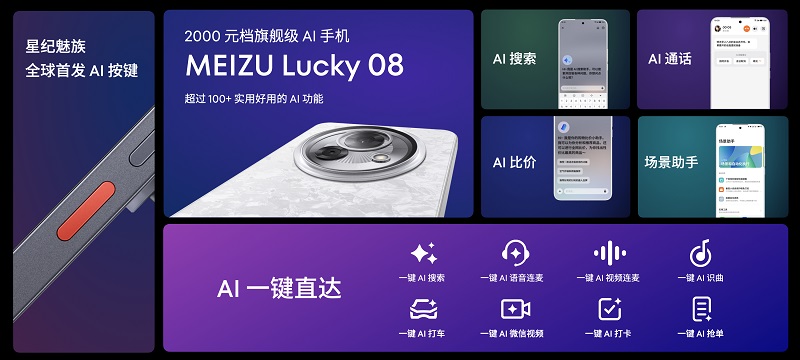 針對廣大用戶在AI功能使用上不夠便捷的痛點,星紀魅族為用戶專門定制多功能 AI按鍵,提供包括一鍵搜索、一鍵打車、一鍵打卡、一鍵微信視頻以及自定義使用場景在內(nèi)的多種功能,只需一鍵雙擊手機,即刻開啟智慧AI新生活?;趶姶蟮腇lyme AIOS操作系統(tǒng),魅族 Lucky 08搭載100+項旗艦級AI技術(shù),其中包括AI搜索、即圈即搜、AI通話、AI比價、AI場景助手等眾多實用好用的AI功能。