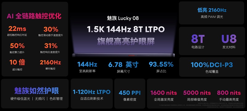 為了給手機用戶帶來更好的屏幕視覺效果,魅族Lucky 08采用一塊6.78英寸8T LTPO 144Hz 1.5K高分辨率旗艦護眼直屏,峰值亮度達到5000nits,在戶外強光底下也依然清晰可見,搭配全面優(yōu)化的AI全鏈路觸控技術(shù),響應(yīng)速度提升50%,并達到10倍超分觸控體驗。
