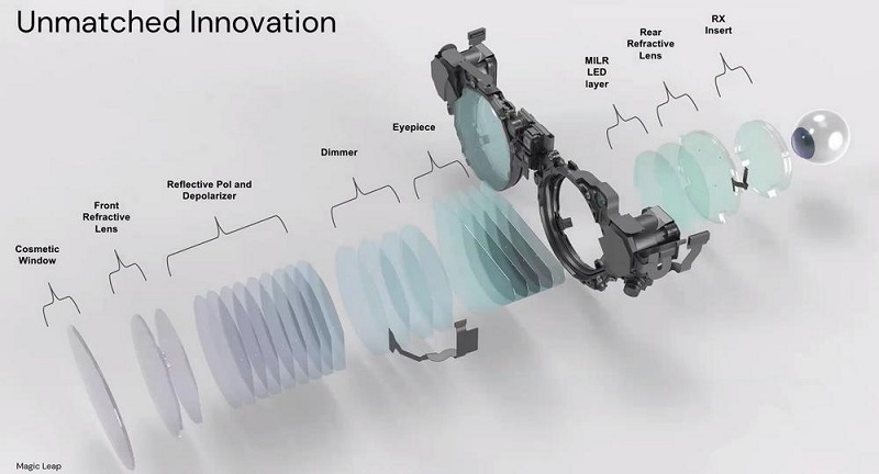 另外,三星也在打造一款由谷歌提供軟件支持的頭戴式設(shè)備,預(yù)計(jì)三星設(shè)備將是一款VR風(fēng)格頭顯,配備像Apple Vision Pro和Meta Quest 3一樣的直通透?jìng)鲾z像頭。而Magic Leap硬件與這三款產(chǎn)品截然不同,其采用透明AR光學(xué)元件。