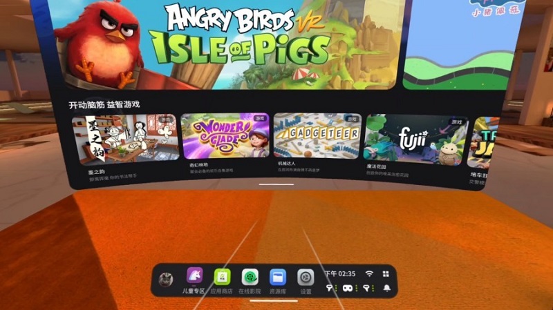 在初始定位完成之后,我們來到了熟悉的主頁界面。畫面下方的導(dǎo)航欄分別包含了系統(tǒng)的幾個主要板塊:兒童專區(qū)、應(yīng)用商店、在線影院、資源庫、設(shè)置、控制中心等等。這里值得注意是本次導(dǎo)航欄新增的兒童專區(qū),這個板塊主要包含一些輕度VR游戲和動畫片。在VR頭顯剛剛進入家庭的當(dāng)下,一個普遍的現(xiàn)象是家長購買VR一體機之后,家庭所有成員都會進行嘗鮮體驗,而對于一些小朋友而言,兒童專區(qū)所包含的內(nèi)容更適合他們體驗,家長在引導(dǎo)孩子體驗VR內(nèi)容的時候也可以更具針對性??吹贸鰜?,奇遇產(chǎn)品團隊增設(shè)兒童專區(qū)的設(shè)計是比較貼近用戶需求的,同時我們也希望產(chǎn)品團隊之后能夠增加明確的信息提示:兒童體驗VR內(nèi)容的時間不宜過長。