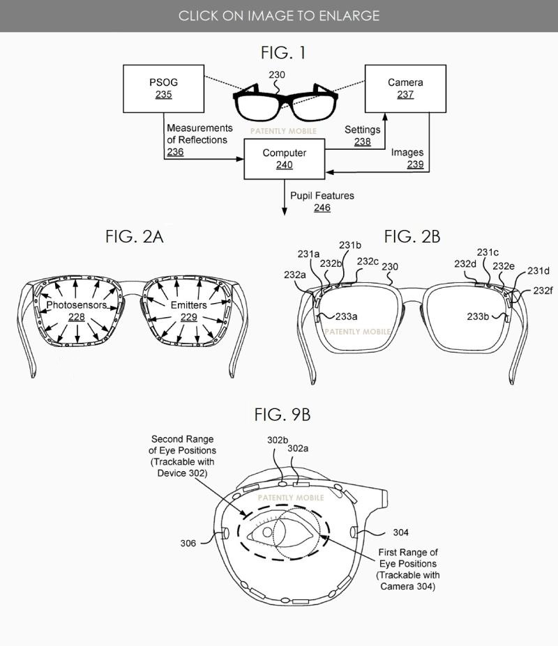 微軟專利圖1示出了包括光電傳感器眼圖描記裝置(PSOG)和相機(jī)的眼動追蹤系統(tǒng)的實(shí)施例;圖2A示出了具有PSOG的智能眼鏡,其基于多個(gè)光源和多個(gè)檢測器;圖2B示出了追蹤雙眼的智能眼鏡上的眼動追蹤系統(tǒng)的實(shí)施例。