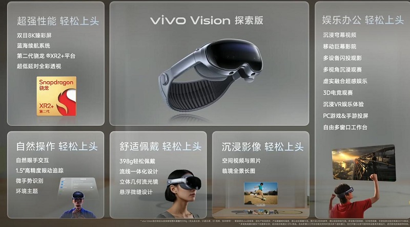 交互體驗上,vivo Vision探索版創(chuàng)新采用自然眼手交互方案,配備1.5°高精度眼動追蹤和微手勢識別功能,讓操作更自然便捷;同時支持空間視頻與照片拍攝、臨境全景長圖創(chuàng)作,為影像創(chuàng)作帶來更多可能。在外觀與佩戴上,頭顯采用流線一體化設(shè)計、立體幾何流光鏡及懸浮微縫設(shè)計,重量僅398g,搭配環(huán)境主題功能,實現(xiàn)舒適佩戴與美觀兼具,真正做到“自然操作輕松上頭”“舒適佩戴輕松上頭”“沉浸影像輕松上頭”。?