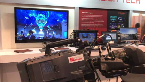 在本次展會上,七維科技推出的另外一款產(chǎn)品是Vibox,該產(chǎn)品最初是七維科技針對廣電行業(yè)而研發(fā)的一款虛擬現(xiàn)實和增強現(xiàn)實產(chǎn)品,經(jīng)歷過多次體育賽事直播、大型晚會直播的不斷修改和提升,已經(jīng)成長為一款很成熟的產(chǎn)品。具有強大的實時渲染能力、三維人物實時骨骼動畫、實時粒子特效及支持PBR材質(zhì)效果等功能。從2012年Vibox誕生起,已經(jīng)先后為央視體育頻道的歐洲杯特別節(jié)目《豪門盛宴》、世界杯特別節(jié)目《我愛世界杯》、2015年央視春晚陽陽動畫人物制作和央視新聞頻道《新聞直播間-博鰲報道》等眾多節(jié)目、活動提供了演播室虛擬現(xiàn)實和增強現(xiàn)實的技術服務。