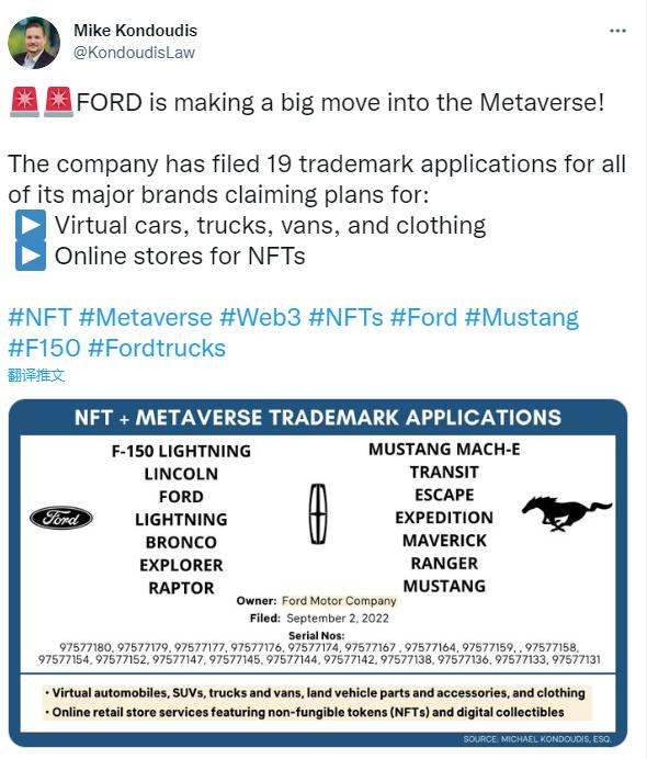 具體而言,這家總部位于密歇根州的汽車制造商提交的申請(qǐng)包括車輛虛擬版本以及在“元宇宙”展示的數(shù)字服裝和車輛零部件及配件,該公司還提交了涵蓋旗下汽車、SUV、卡車和貨車的藝術(shù)品、文本、音頻、視頻NFT商標(biāo)申請(qǐng)。