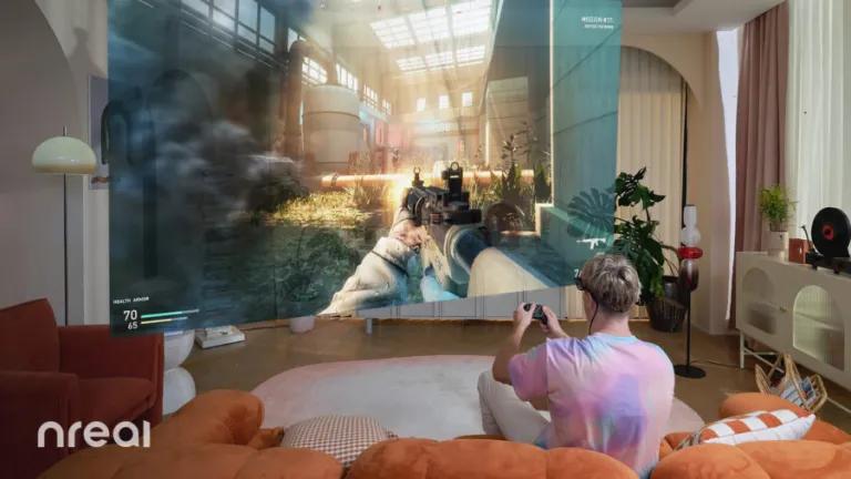 Nreal Air重量僅為79g(不含線纜和鼻托),隨身折疊輕巧便攜,玩家戴眼睛上可以自由享受130英寸巨幕,無論是躺著玩、坐著玩、走著玩游戲畫面始終在眼睛正前方,隨時躺著玩《賽博朋克2077》、《原神》、《塞爾達傳說:荒野之息》等熱門游戲大作,是一款可以Everyday Carry的游戲躺贏神器。