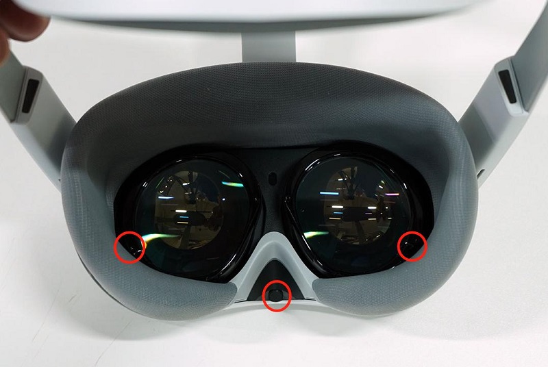 PICO 4 Pro最值得一提的升級(jí)是頭戴內(nèi)側(cè)增加了3個(gè)紅外攝像頭,其中兩顆分別位于兩側(cè),另有一顆位于中間下側(cè)。眼球追蹤需要用到兩側(cè)的2顆紅外攝像頭,分別對(duì)左右眼的眼部肌肉變化實(shí)時(shí)追蹤,從而獲取眼球/瞳孔位置;面部追蹤需要用到這3顆攝像頭,實(shí)時(shí)捕捉五官的形態(tài)變化及周圍肌肉變化。
