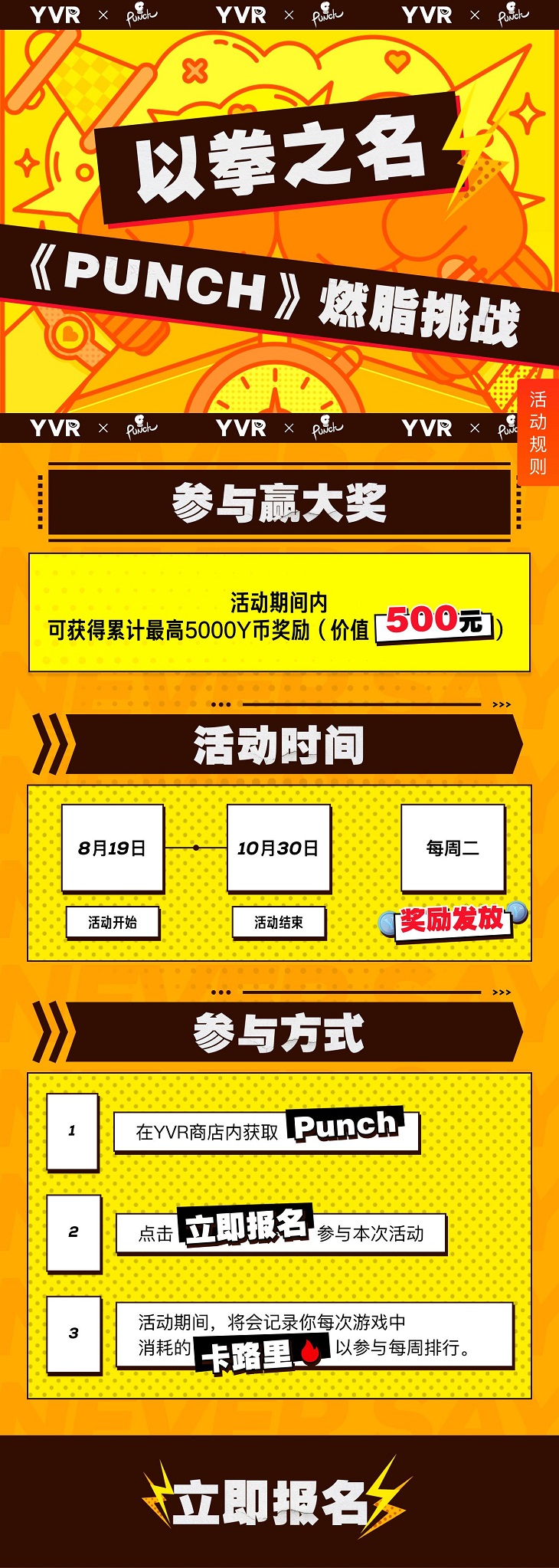 本次《Punch》上線,YVR展現(xiàn)出了相當(dāng)?shù)恼\意,報名參與燃脂挑戰(zhàn)活動(8月19日起至10月30日),玩家將有機(jī)會獲得5000Y幣的獎勵。還等什么?趕緊行動起來,戴上你的YVR眼鏡,一起快樂健身,輕松燃脂吧!
