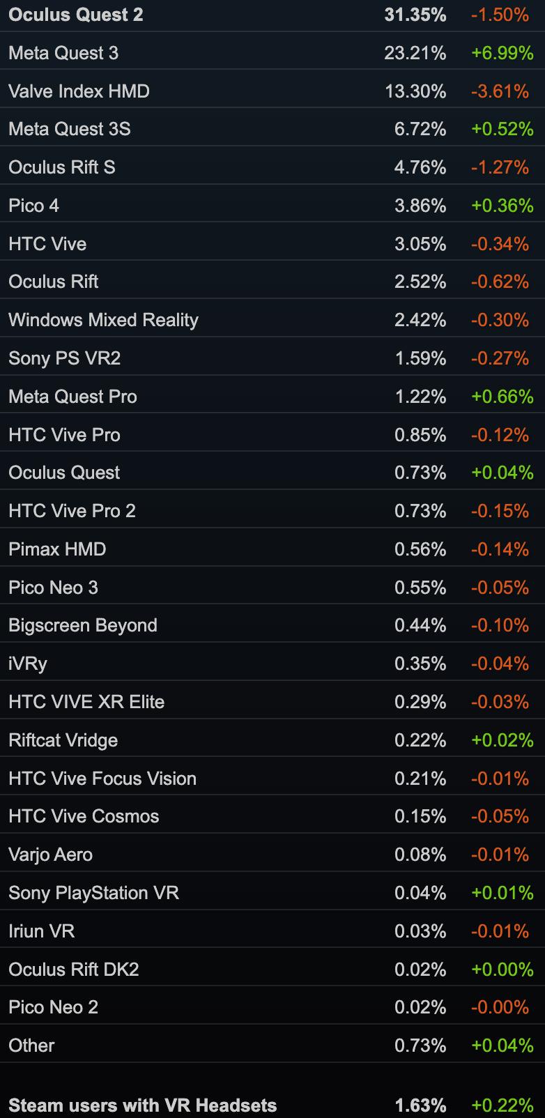 在Valve發(fā)布的Steam硬件與軟件調(diào)查中,“Meta Quest 3”的相對使用份額增長了6.99%,其與Quest 2的差距縮小至歷史最小。需要說明的是,此處給Quest 3加上引號,是因為當用戶通過Meta官方的Quest Link功能或Guy Godin開發(fā)的虛擬桌面連接時,SteamVR會將Quest 3S頭顯同樣識別為“Meta Quest 3”。據(jù)我們了解,僅有通過Valve官方Steam Link連接的Quest 3S頭顯,才會被單獨標記為“Meta Quest 3S”條目。