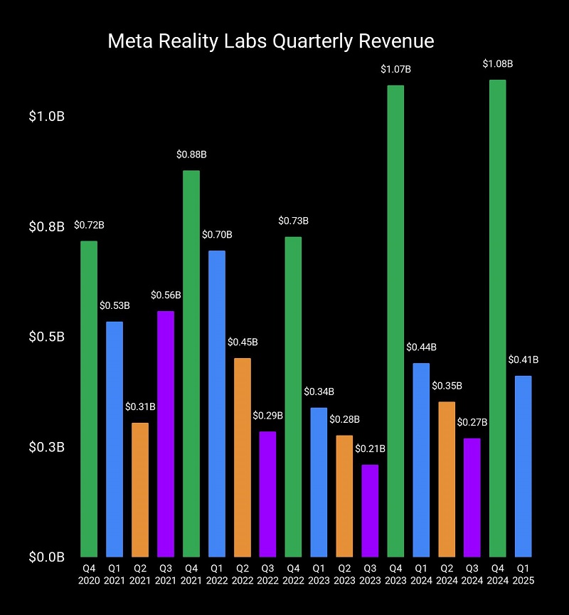 在科技行業(yè)競(jìng)爭(zhēng)日益激烈的當(dāng)下,Meta Reality Labs的業(yè)績(jī)動(dòng)態(tài)備受矚目。最新數(shù)據(jù)顯示,Meta Reality Labs 2025年第一季度的季度收入較2024年同期出現(xiàn)顯著下滑,降幅達(dá)6%。具體而言,本季度Meta的元宇宙和可穿戴設(shè)備部門(mén)收入為4.12億美元,而2024年第一季度的收入則為4.4億美元,這一數(shù)據(jù)直觀反映出該部門(mén)面臨的市場(chǎng)挑戰(zhàn)。?