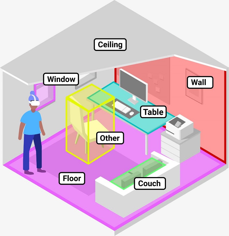 對比下Quest 3的開發(fā)者文檔,里面有相當(dāng)重要的一部分是關(guān)于Scene Model,也就是Quest 3會如何感知周圍環(huán)境并提供哪些數(shù)據(jù)給開發(fā)者。
