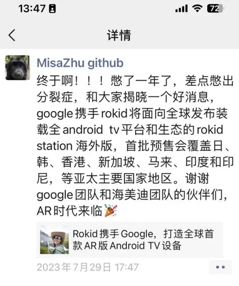 去年7月底,祝明銘同樣在朋友圈發(fā)布了一條信息,稱谷歌攜手Rokid,打造全球首款A(yù)R版Andorid TV設(shè)備。也許是我們的閱讀能力還不夠吧,總是會把祝明銘在朋友圈發(fā)的話曲解成谷歌和Rokid一起研發(fā)了AR版Andorid TV——Rokid Station(全球版),谷歌還會幫助Rokid做全球的發(fā)布和銷售。