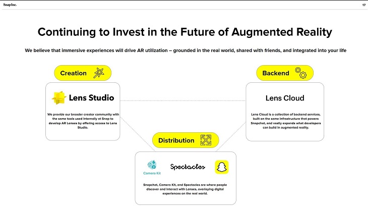 在一份面向投資者的幻燈片中,Snap強(qiáng)調(diào)將繼續(xù)投資AR ,重點(diǎn)介紹其主要應(yīng)用Snapchat、Camera Kit AR軟件開發(fā)工具包和Spectacles AR眼鏡平臺(tái)。