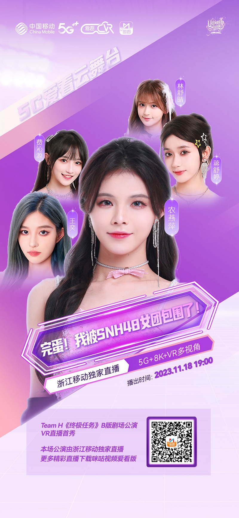 打開(kāi)咪咕視頻愛(ài)看版、移動(dòng)云VR、愛(ài)看VR,點(diǎn)擊【完蛋,我被SNH48女團(tuán)包圍了】,或者掃描下方二維碼,即可加入SNH48直播大型劇場(chǎng)公演!快樂(lè)加倍,移動(dòng)伴你奔赴現(xiàn)場(chǎng),不見(jiàn)不散!