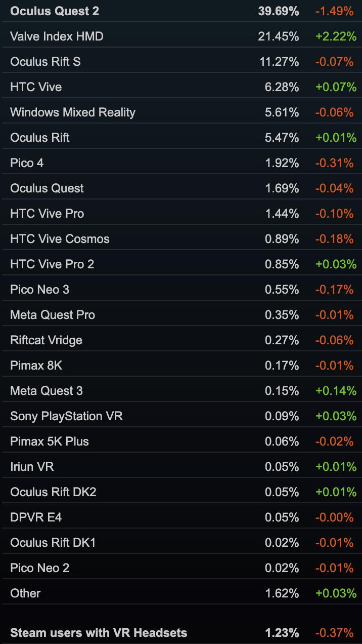本月Meta陣營(yíng)設(shè)備占比為66.84%(-0.03%)。細(xì)分來(lái)看,Meta Quest 2占比為38.27%(+0.17%),Meta Quest 3為15.49%(-0.07%),Oculus Rift S為7.63%(+0.13%),DK1為0.01%(+0.00%)、DK2為0.04%(-0.00%)、Meta Quest Pro為0.64%(+0.07%)、Quest為1.04%(-0.02%)、Oculus Rift為3.72%(–0.31%)。