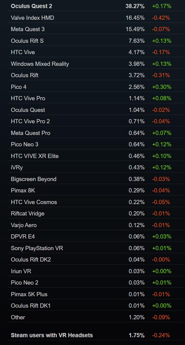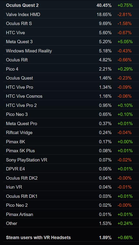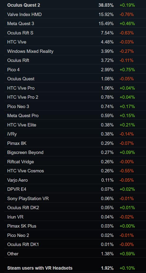 近日,Steam平臺(tái)公布了2023年9月的軟件與硬件調(diào)查報(bào)告。本月報(bào)告數(shù)據(jù)顯示,Steam平臺(tái)VR用戶占比相比8月下降幅度較大,降至1.60%(-0.32%)。其中,Meta Quest 2占比下跌0.76%成為波動(dòng)最大的硬件,其他硬件用戶未出現(xiàn)重大變化,均以小幅度波動(dòng)為主。