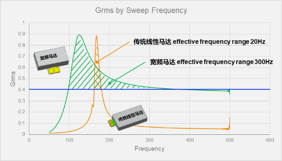 不過,鑒于金屬彈簧的物理結構的諸多限定,線性馬達的有效振動頻率被限定在了諧振頻率在某一固定頻率f0,偏離其f0后振動量急劇衰減,從而失去觸覺反饋的效果輸出。換而言之,線性馬達為一類窄頻(單頻)振動馬達,觸覺效果很有限,在需要滿足調頻、跨頻場景的效果輸出上,表現(xiàn)有所折扣,并且應用調試上需要大量時間來精細調試振動頻點的反饋,這需要的人力和物力成本,也只有較大體量公司的產品會投入大量資源來優(yōu)化和豐沛。