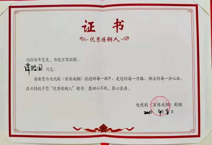 2021年4月8日,劇組在衡陽(yáng)鋼管廠拍攝完最后一個(gè)鏡頭,舉行了隆重的殺青儀式,王雷等一批主創(chuàng)和主演特意專程趕到衡陽(yáng),為的是見證這一有意義的時(shí)刻。大家感慨萬(wàn)分,十年前的相遇到十年后的再度合作,十年磨一劍; 100天拍攝一百年的歷程,更是彈指一揮間。我們都期待《百煉成鋼》能在紅色經(jīng)典影視作品的創(chuàng)作中勝出,不但成為向建黨一百年的佳作,更能成為新時(shí)代受眾認(rèn)同的精品。