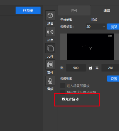 在 Creator 編輯器端勾選允許拖動,在大屏播放器和VR播放器端播放交互式內(nèi)容時,用戶可根據(jù)場景需要與內(nèi)容需求拖動元件到任意位置。