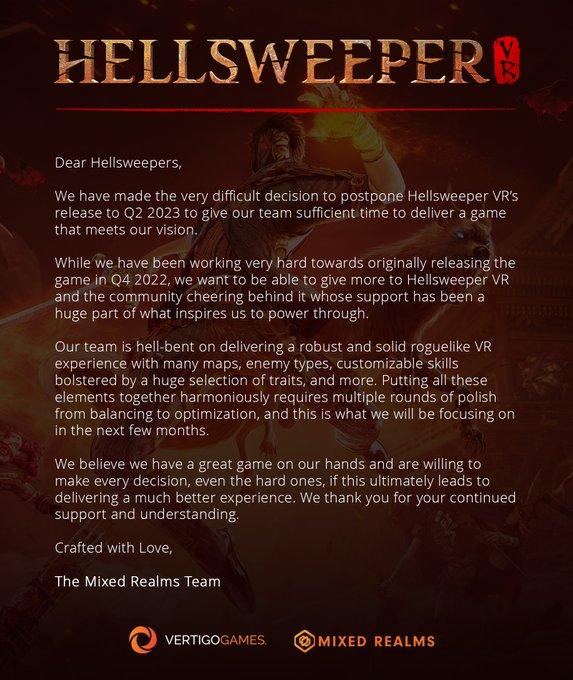 Mixed Realms最初目標(biāo)是在2022年第四季度推出「Hellsweeper VR」PC VR版本,隨后推出 Quest 2版本,如今,Mixed Realms已將「Hellsweeper VR」的發(fā)布推遲到2023年第二季度,該工作室表示,這一決定將“給我們的團隊足夠的時間來打磨游戲”。