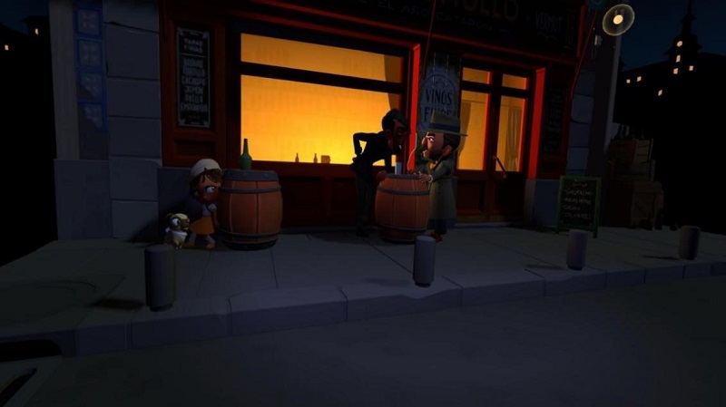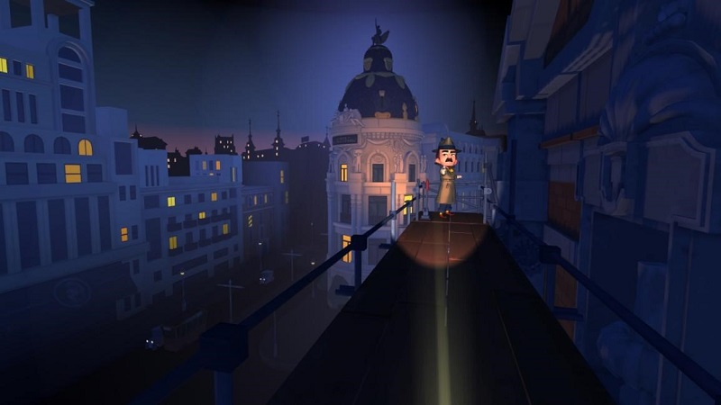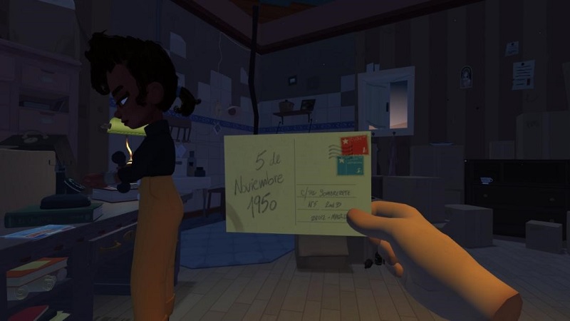 例如,在陪同羅拉清理她叔叔的公寓時,你可以與羅拉進行各種對話及交互,還可以通過控制器操控影片中的虛擬雙手打開臺燈、撿起并查看掉落在地板上的信件、拉開叔叔的抽屜翻看他留下的各種書籍、拿起叔叔留下的舊煙斗吸上幾口。在后續(xù)的劇情當中,觀眾甚至還會化身為兒時回憶中的小羅拉,用相機偷拍叔叔與神秘人的“犯罪證據(jù)”、用手電筒在夜色中尋找躲避警察追捕的叔叔的身影等等……各種操作簡單但卻極具趣味性的交互設(shè)計讓我不知不覺就完全沉浸在了這部影片當中,再加上影片精心選配的背景音樂,我竟一度忘卻了我只是在觀影,內(nèi)心甚至感受到一種強烈的緊張和興奮感,仿佛此刻我真的變成了一名偵探,在濃濃夜色籠罩下的神秘馬德里親眼見證了一場驚天犯罪案件。