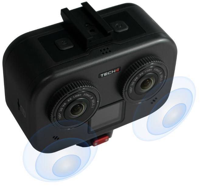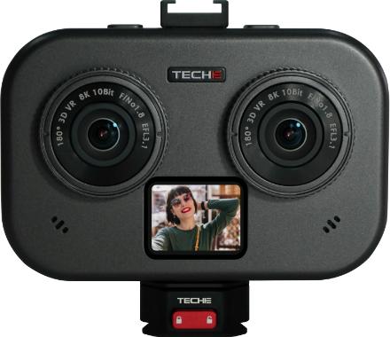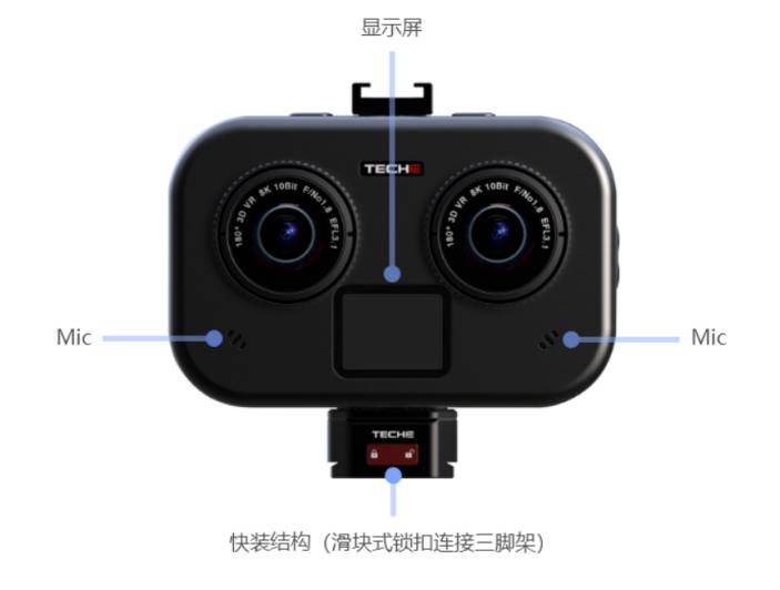相機整體呈長方體形狀,正面配備兩個索尼1英寸堆疊式CMOS圖像傳感器,可以以30fps的速度在相機內進行8K直播;兩個鏡頭下方設置了雙麥克,可模擬左右耳立體收聲;除此之外產(chǎn)品正面還設置了一塊1.5英寸顯示屏,在拍攝過程中主播可根據(jù)顯示屏的畫面調整自己的位置和走位。