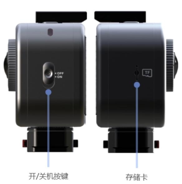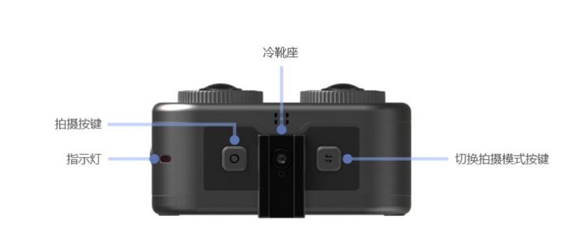 相機的頂部主要由拍攝按鍵、模式切換按鍵以及指示燈組成,此外,考慮到VR直播需要接入各種外接設備,產(chǎn)品還特意在頂部加裝了一塊冷靴座。