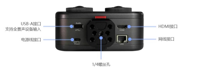 相機的底部結構較為復雜,正中央是一個用于與三腳架連接的滑塊式快裝器,兩側的四個接口分別是用于接入全景聲設備的USB接口、電源線接口、HDMI接口以及RJ45千兆網(wǎng)線接口。