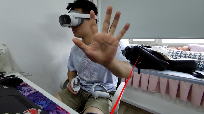 通過頭顯端看到的直播畫面并沒有出現(xiàn)畫面缺失或明顯的拼接痕跡等情況,180度的拍攝畫面完全填充了整個畫框,直播畫面看起來干凈且清晰。由機內AI拼接的人物合像也毫無破綻,直播畫面中的人物并沒有出現(xiàn)虛影或重影等情況,左右眼合成的3D效果很明顯。并且由于「3D180VR」的視頻輸出接近原畫品質,雙目影像呈現(xiàn)更是達到了8K水平,因而拍攝畫面在很大程度上保留了原有的細節(jié)和色彩,甚至當我在距離相機一米以外舉起手時連掌紋都清晰可見。