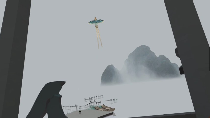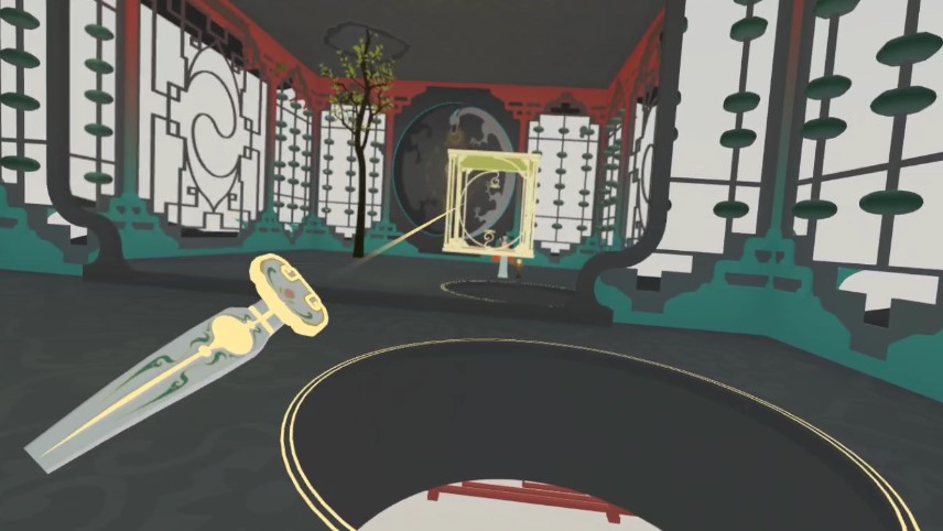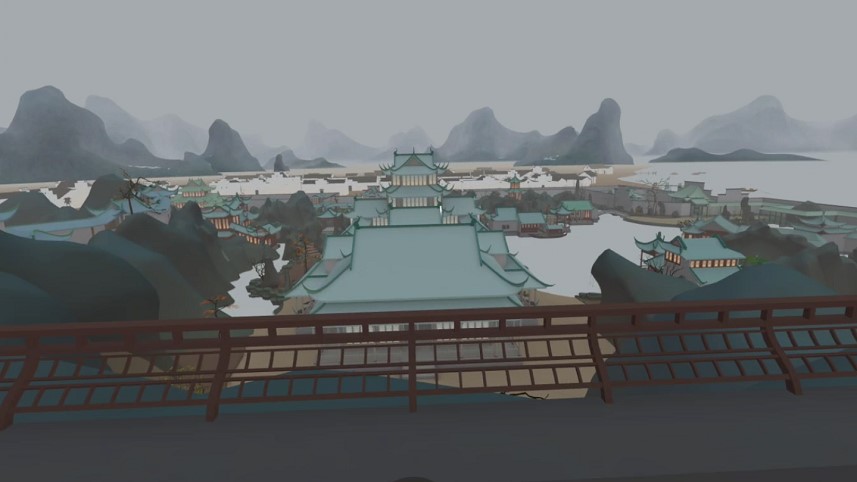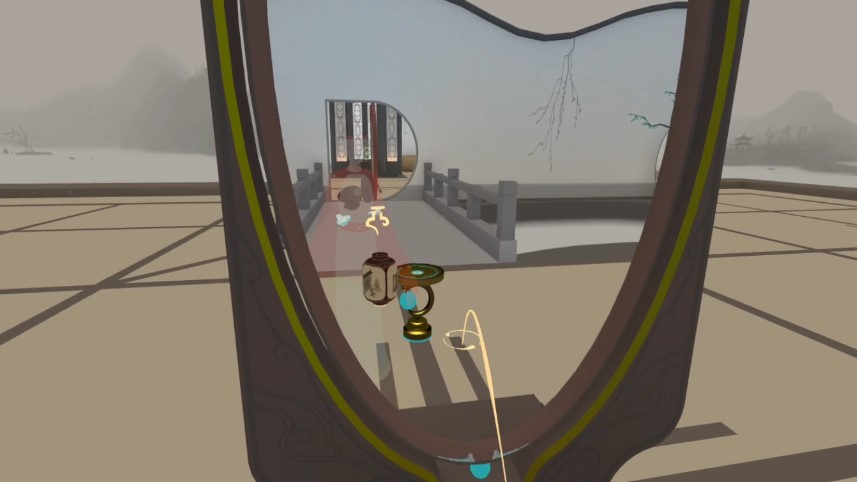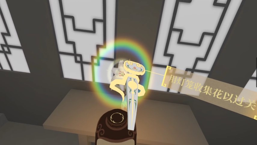 一進(jìn)入游戲,我們就可以感受到那種濃濃的“中國味道”,游戲的遠(yuǎn)景采用類似水墨畫的美術(shù)設(shè)計(jì),朦朧且寧靜,而身邊的建筑和物品的模型更接近low-poly風(fēng)格,頗有一種“國風(fēng)版紀(jì)念碑谷”的感覺。這樣的美術(shù)設(shè)計(jì)自然有其合理之處:一方面游戲的渲染資源被極大的節(jié)約,即使在VR一體機(jī)這樣的輕量級設(shè)備也可以輕松運(yùn)行;另一方面也非常符合國風(fēng)解謎的玩法,玩家可以在盡可能簡單的場景中更容易找到解謎線索,解謎效率因此也被大大提升。