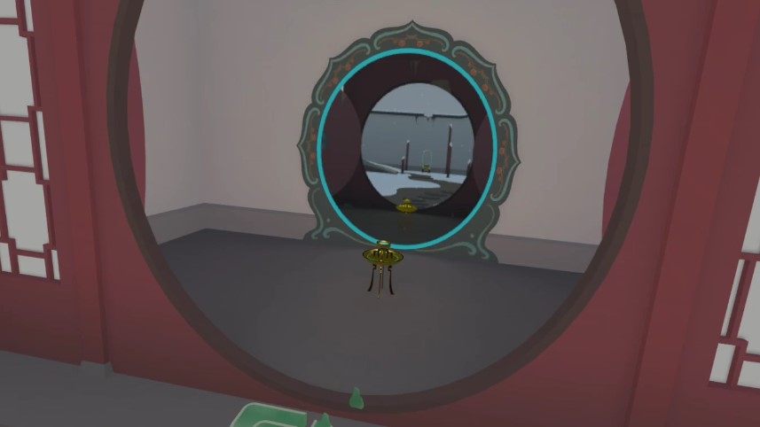 在具體的操作上,主角的移動(dòng)采用瞬移方式,玩家基本不會(huì)出現(xiàn)“暈VR”的情況,而游戲中大部分的操作都與我們手提的燈籠相關(guān)。前面已經(jīng)提到,游戲中大部分關(guān)卡的場景都比較簡單,這樣既能體現(xiàn)出中式美術(shù)“留白”的特色,同時(shí)也是為了讓玩家在尋找解謎線索時(shí)更加聚焦。作為一款解謎游戲,本作真正考驗(yàn)玩家的是解謎的思路,并非操作的難度,而解開謎題的關(guān)鍵就是利用關(guān)卡中出現(xiàn)的鏡子:現(xiàn)實(shí)中的世界無法改變,但鏡中的世界則可以改變。