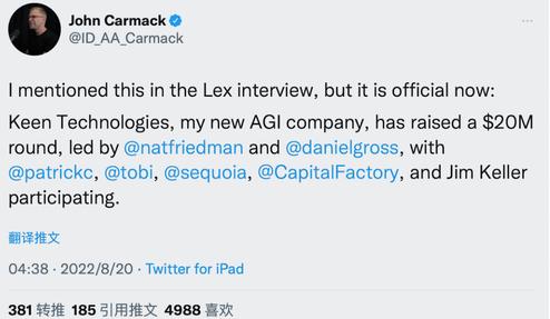 獲悉,8月20日,被譽為“3D游戲之父”同時也是Meta首席技術(shù)顧問的John Carmack發(fā)推文宣布再次創(chuàng)業(yè),將主攻AGI(Artificial General Intelligence,通用人工智能)。