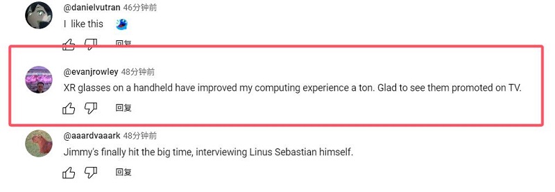不僅吉米在視頻的最后總結(jié)說:“This is an amazing segment!”(這是一個很棒的環(huán)節(jié)),這段視頻切片在油管上的播放量也迅速突破了100萬,點贊數(shù)超過9萬。更是有觀眾在評論區(qū)留言說:“掌機設(shè)備和XR眼鏡的組合大大提升了使用體驗。很高興見到它們在電視節(jié)目上得到推廣?!?/p>